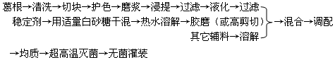 1)清洗:在流水池中用刷子清洗葛根表皮上的泥土,并切去干縮,病蟲污染及霉爛變質部分。  2)磨漿:將葛切碎塊后,放入異VcNa護色液中。護色液重為葛重的1.8倍。打漿機打漿,靜置。調節護色液的pH值為6.0、靜置時間80分鐘,靜置溫度25以進行浸提。  (3) 過濾:過80目濾布,并以適量水清洗葛渣,一起并入濾液中,即得葛全汁。算出凈葛重量(凈葛重:洗凈的葛重一被切除的霉爛部分重一葛渣重),調節葛全汁中的水量,使水與凈葛的重量比為5l。 (4)液化:用耐高溫q一淀粉酶進行液化。調節葛全汁的PH值為6.0,酶解溫度為80,酶解時間35分鐘,加酶量為葛凈重的4%。(5)滅酶:在121的超高溫下,保持5秒。  6)冷卻、過濾:迅速使料液溫度降至2左右,過200目濾布,再用鋪有約05cm厚的硅藻土濾餅的抽濾裝置抽濾。