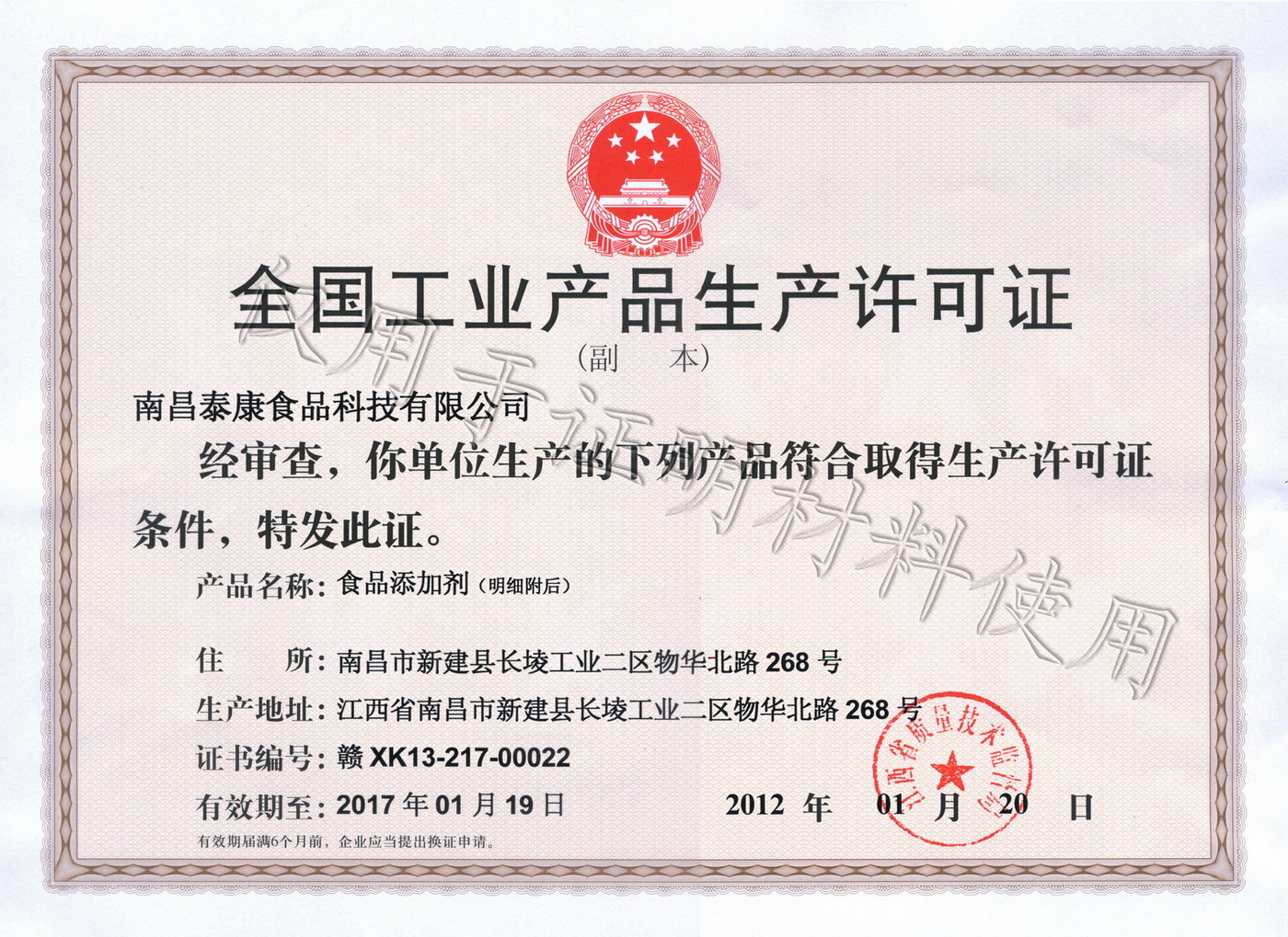 萬象更新氣勢新,新年伊始,從江西省質量技術監督局傳來喜訊,經過近5個月的努力,日前,我公司生產的復配食品添加劑產品通過了國家工業產品生產許可證企業審核,順利獲得由江西省質量技術監督局批準頒發的《全國工業產品生產許可證》(證號:贛XK13-217-00022),產品為食品添加劑,包含復配甜味劑、復配防腐劑、復配抗氧化劑、復配乳化增稠劑等產品。